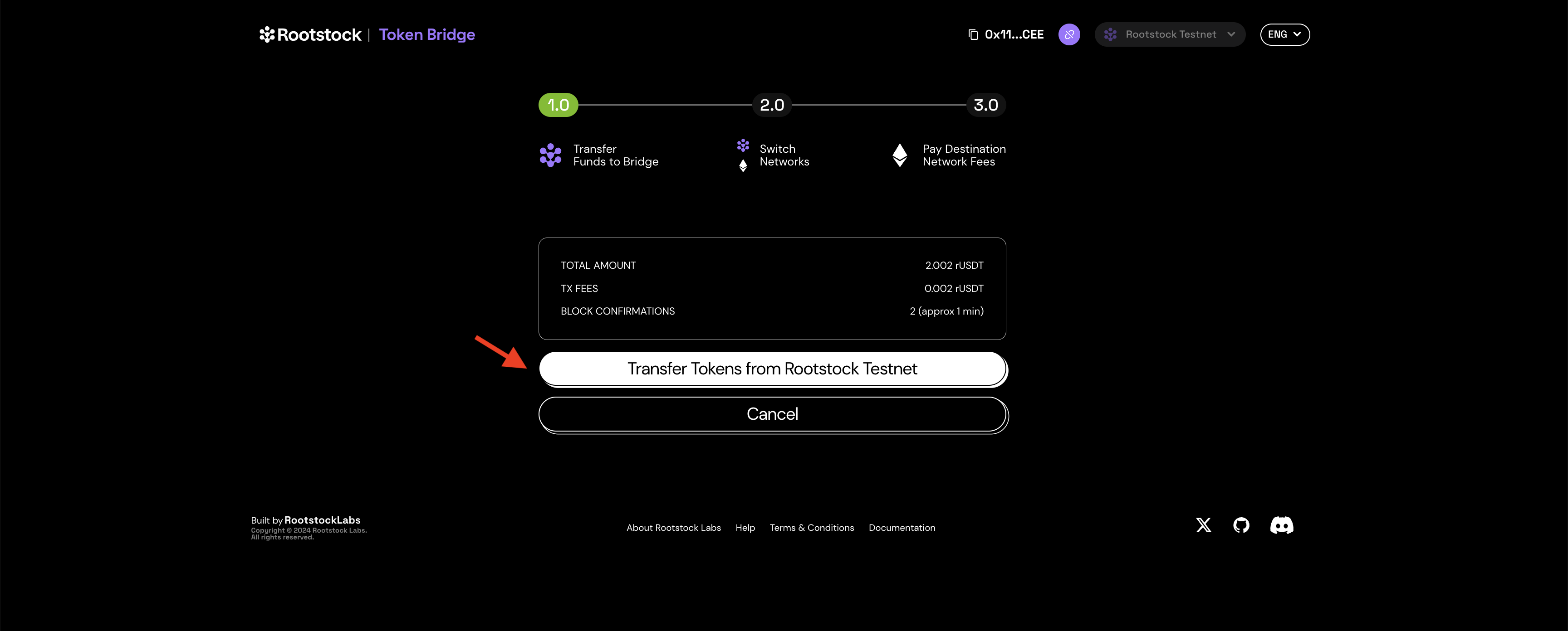 Confirm transaction, fees, and confirmation time and click on Transfer Tokens from Rootstock Testnet.